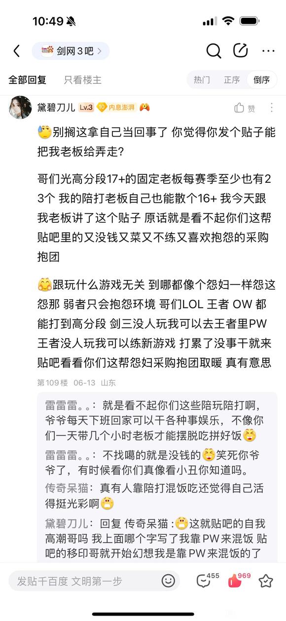 剑三的嘎子代打是我见过最恶臭的,就是为了钱什么都干,能让裤裆的2两肉爽什么都做。100级赛季初彻底跟自己那群高端竞技场圈子亲友拜拜了,我也不后悔。人家干了陪玩以后每天想的就是陪老板,啊,赚钱不寒颤,咱不说啥,但是腌臜事干的就多了,有情缘了跟女老板搞暧昧,打游戏还是在自己情缘的YY,说这么刺激。老板送号送头像就要,号到手就卖,问就是都送我了,我还不能卖?老板知道了让还钱,直接管老板叫疯批,没陪玩了就接点吃鸡B单,怎么刷呢? 进去挂机- -要么就战场挂机。打排名队的时候就是抢号主,对喷,甚至雨秃子还干过给别人借的号挂登陆界面的事