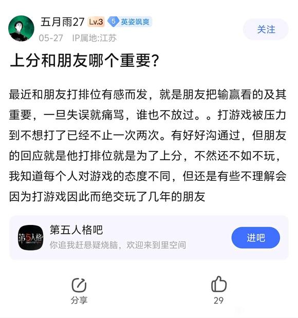 没想到有生之年居然可以被挂在贴吧里 本人事先声明 压力属实 上升父母无妄之灾 只会骂他们本人 本人第五人格段位不高 巅峰低星守门员 我打这个游戏就是要上分 打个竞技游戏要上分有啥问题 我觉得我并没有任何不妥的地方 每次打排位也没给他们压力 选个修机位选溜鬼点 口中的一旦失误的背后 是每天都在失误 是一中午一晚上失误一天 我去找和我实力一样的车队 我胜率不会打的那么难看 压力的背后 还有每次失误沟通 不声不吭 一点回馈不给我 下一把也不报点 不沟通 说是压力不如说是互给脸色 我自认为你要你朋友带你打排位 别人高段位不理你 我带你打 我给你抗压 带你赢 你坑了我还要安慰你 我觉得我不是陪玩 为什么你坑了我我还要给你情绪价值 这是我最生气的一点 你打游戏抱着自己思维打 不听指挥 还要怪你朋友语气不好 到底谁自私 评论区骂我骂的很狠 也没有帮我讲话 我不行了 你们作为一个打的稍微有点实力的玩家 未免做的有我好 我打的中途也从来没有说过 我和你们打的太累 我不如换彻车队 我觉得本人已经做的很好了 没有吵架 就是客观讨论 我并不觉得是我的问题 只是发出来问问大家![]() ![]() |