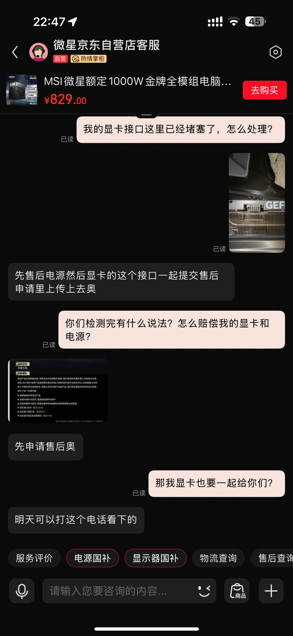 请问老哥们我应该怎么做?烧的时候还是亮着机正常工作的,除了接口显卡别的部位会不会受影响?微星把线材拿回去不会就翻脸不认账了吧?