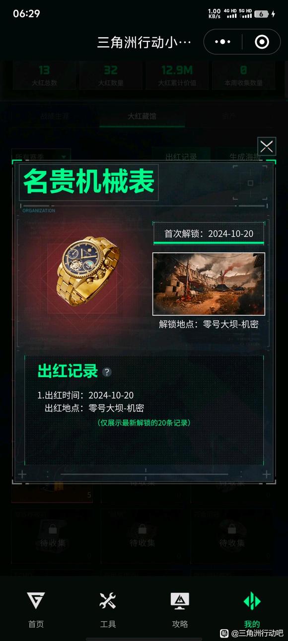 后面翻小程序才找出来,是10月20出的劳力士,我第一个号打航天打到破产,不过s1普坝军营二楼电脑给我出两回超算让我记忆犹新啊,还有军营弹药箱出的炮弹但是被别人踹死了