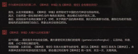 《黑神话:钟馗》官网答疑 单机动作游戏 登录PC和家用机