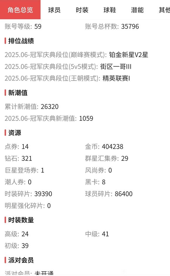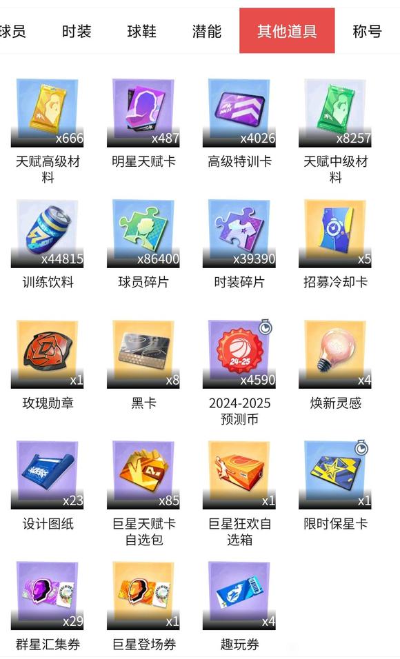 : 橙卡满突性价比不高,都没满突,宇航员套装和烈焰骑士套装,一个熊猫头,两双词条鞋,永久会员,时装碎片4w,球员碎片8.6w,挂多少合适兄弟们