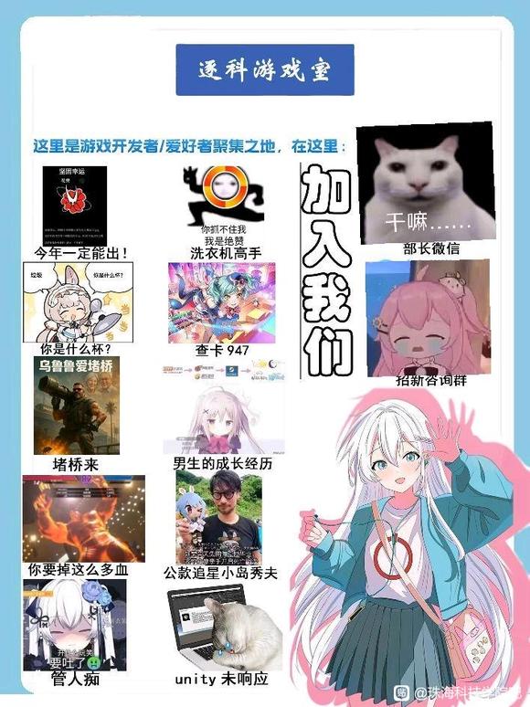| 在这里我简单介绍一下,逐科游戏室是学校里头游戏爱好者/游戏制作者同好聚集的社团,在这里你可以认识到很多志同道合的朋友以及学习到不少游戏制作的知识,逐科游戏室海纳百川旨在吸引不同特质的有志之士加入我们,欢迎各位同学了解和关注。 社团建立至今已有八年,期间也诞生了不少前往游戏大厂的同学(不同岗位),社团交流氛围浓厚,很多已经毕业的学长也会热心的提供帮助和交流。社团的兴趣活动丰富,2022年举办过校内多达40个队伍的APEX逐科杯活动以及各项小型比赛,社团会不定期的筹办和布置游戏分享会和剧本比赛/桌游局等游戏相关的内容,社团的成员涵盖各类游戏(格斗游戏,音乐游戏,主机游戏玩家,游戏王/炉石传说)而且也会讨论游戏机制和规则之间的合理性和运营方针。 社团也会提供和帮助想要参加GameJam游戏项目的同学,在这些年的积累下社团也产生了很多游戏产品Demo并且会教授新来的同学们很多游戏机制,游戏制作,游戏策划案等游戏制作的知识旨在让新来的同学们来这能够有所收获。 长文有点正经,也是第一次通过这的形式来进行宣传,如果觉得有一点心动的可以扫下面的QQ群进行了解,欢迎大家来玩 (二编:贴吧发帖不允许有二维码,群号在下面 ![]() |