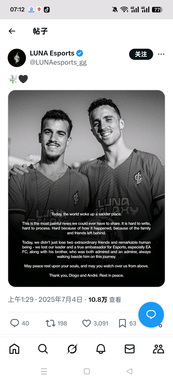 迪奥戈·若塔 (Diogo Jota) 因车祸去世。他是 Luna Galaxy(Dota 2/火箭联盟)的老板,原本计划推出 CS 战队阵容。