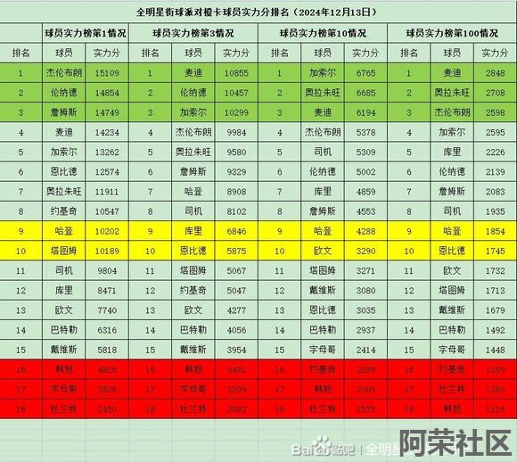 选取的样本:各球员排名第一的分数(头部,体现该球员最高上限的综合评价),排名第三的分数(三甲,尽量去除第一的样本差异,体现该球员山巅级综合评价),排名第十的分数(十大,进一步扩大样本,体现该球员准山巅级综合评价),排名第一百的分数(百大,排行榜能获取的最大样本,能有排名一定是在该球员的使用上有一定实力,超越大部分同球员使用者的玩家了,体现该球员进入超凡级别的综合评价)。 标注颜色:绿色为前三,黄色为中段分割线(第9和第10),红色为垫底三名。 以下分析会基于1/2/3位的基础上评价,但是有的球员有摇摆属性,在不同阵容中的角色不一样,受时间精力影响,不再细分,只在传统认知下的球员定位基础上分析讨论。 从排名第一的分数情况分析:出乎意料,前3均为2号位球员,贴吧公认1号位以及3号位最强的麦迪和奥拉朱旺分列第4和第7,朱旺的分数甚至不如家嫂和恩比德。约老师排名好过戴维斯和韩旭,强势排名第9,从某种程度上印证了“组排无敌”的风评,但是离3号位排名第一的家嫂有较大差距。从这个排名来看,布朗小卡詹皇作为2号位在高端局均有表现,能够在顶级舞台展现风采,塔图姆作为2号位明显势微,巴特勒沦为2号位之耻。1号位麦迪一骑绝尘,哈登勉强能有表现,司机库里欧文紧随其后,杜兰特无论作为2号位还是作为1号位,均上不了台面。韩旭字母在3号位中垫底,高端局没有生存空间,值得一提的是浓眉断崖式下滑,说明玩家对其在高端局的表现已失去信心。 从排名第三的情况分析:麦迪小卡家嫂分列前三,但是在巅峰赛匹配观感上来说,小卡和家嫂均不是2号位和3号位第一选择,来到这个位置说明强度是够的,布朗从第1掉到第4,但是没有拉开明显差距,哈登司机排名上浮,且在排名上半区,说明在顶端征召局,在麦迪被抢的情况下,哈登和司机仍是玩家值得信赖的第二1号位人选,詹皇第6的排名虽然不及小卡和布朗,但是仍堪大用,恩比德排名下滑,掉出上半区,且和家嫂大梦差距明显,强度上还是有所不足。约老师掉入下半区,已初见颓势。垫底3废排名不变,最后6名排名也没变,说明垫底的这几个是真不行。这里点名说一下杜兰特,杜兰特排行榜第一的分数,即使放在排行榜第三分数中,排名中依旧垫底,令人泪目。巴特勒在这个榜单中依然是2号位最废,韩旭字母在3号位中卧龙凤雏,谁也别瞧不起谁。 从排名第十的情况分析:家嫂大梦代言3号位,麦迪代言1号位,布朗代言2号位,传统1号位球员强势迈入上半区,没有一个掉入下半区,说明在这个排名段,进攻手仍是稀缺资源,均能有所表现,小卡在2号位的表现依旧不弱,没有和布朗拉开差距,库里排名继续提升,仅次于单打型的1号位麦迪和司机。恩比德排名继续下滑,和浓眉半斤八两。约老师则一路俯冲掉入最后三名,杜兰特巍峨不动,锁定垫底位置。 从排名第一百的情况分析:麦迪大梦布朗占据前三,符合版本组合的观感,最强势123号位搭配,没有之一。家嫂库里小卡次之,是最强123号位下的第一替代人选,詹皇在这个分段没有掉队,和小卡大体持平,传统1号位在这个排名中依然平稳,约老师杜兰特韩旭依旧锁定“三废”,韩旭更是强势来到垫底位置,让阿杜感受到些许温暖。 综上:1号位上,麦迪在现版本1号位中一骑绝尘,司机、哈登、库里,互有千秋,也能在麦迪之下有所表现,但是差距明显,欧文则在各排名中垫底,强度为1号位最差。 2号位上,布朗小卡詹皇均有表现,布朗整体稍强,但没有拉开差距,三人几乎平分秋色,獭兔整体排名中游,符合“中规中矩”的印象,巴特勒排名最后,2号位最废,没有争议。 3号位上,大梦家嫂整体强势,高端局家嫂表现略优,但大梦也不遑多让,差距不明显。恩比德稍次之,韩旭全排名垫底,最废没有争议。字母哥和约老师基本半斤八两,字母甚至排名高过约老师一筹,但是最最顶端的局里约老师明显更强,说明字母哥在所有玩家手里,同位置比较都是废物,约老师在99%的玩家手里,同位置比较都是废物。戴维斯被一刀怒砍后,已从神坛跌下,不具往日风采。 看到这里可能有朋友说为啥不说杜兰特呢。 杜兰特:求求你别说了~ ![]() |