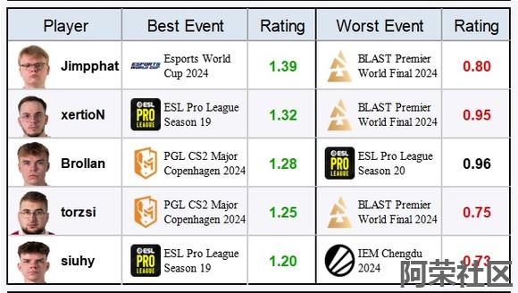 那么就来盘点下今年前十队伍各位选手的“潜在上限”即发挥最好的赛事数据,另附赠最差赛事数据。