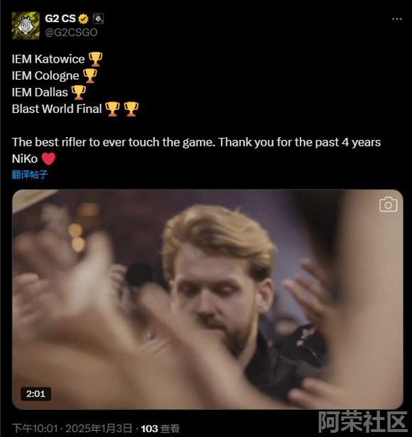 : G2官宣队内明星选手NiKo离队:IEM卡托维兹🏆IEM科隆🏆IEM达拉斯🏆BLAST全球总决赛🏆 🏆史上最棒的步枪手。感谢NiKo在过去四年的支持❤️