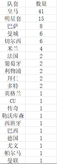 楼主历时近一个月,踢了一百把世界段位的比赛,具体阵容见我上个帖子,中间定级赛加其他段位的比赛没有记录,现将结果总结如下。皇马套断档领先,所占比例达到惊人的四成,第二档是明星套(也就是无套),接下来巴萨曼城切尔西米兰算是其他队套里见的比较多的了,遇见的剩下的队套也就大差不差,都是一两把左右。